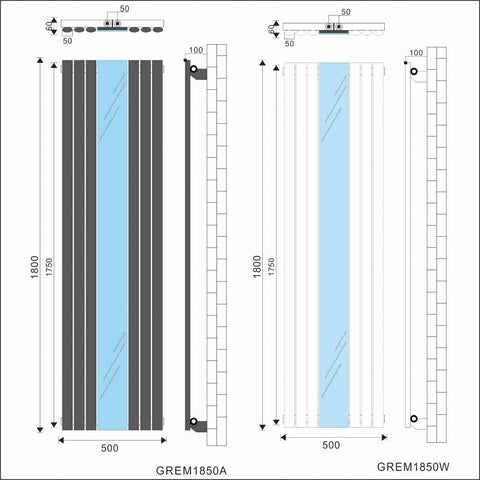 SONNI Röhrenheizkörper mit Spiegel Mittelanschluß Wandheizkörper 1800*500mm Weiß ohne/ mit Multiblock