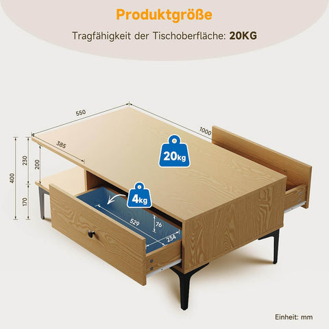 SONNI Couchtisch, Wohnzimmertisch, Kaffeetisch, mit 2 Schublade und 2 offener Fach, modern Holzmöbel für Wohnzimmer, Büro, Schlafzimmer, 100 x 55 x 40 cm, Holzfarbe, Platzsparend, Einfache Montag