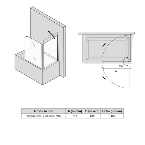 SONNI Duschwand für Badewanne mit Seitenwand Schwarz NANO-GLAS Badewannenaufsatz faltbar Duschabtrennung Badewanne 80x140 cm(BxH)