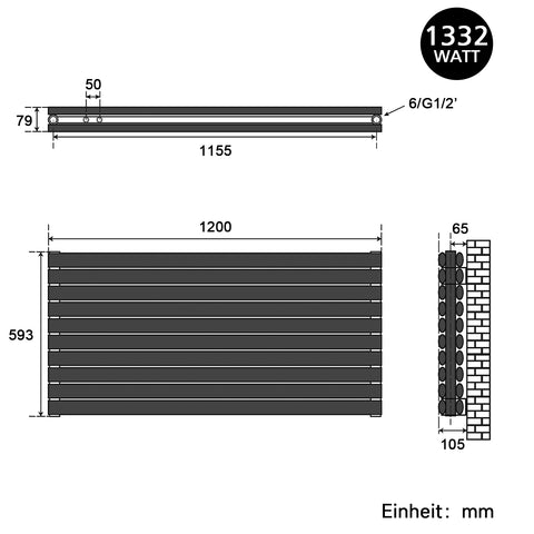 SONNI Heizkörper Design Röhrenheizkörper Horizontal Paneelheizkörper Seitenanschluss Doppellagig Badheizkörper 593*1200mm Anthrazit ohne/mit Mutiblock