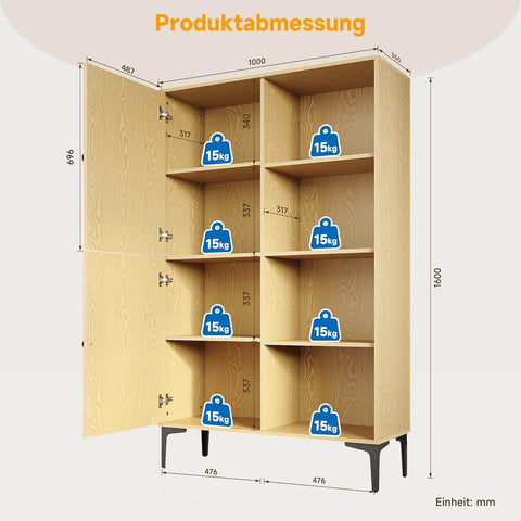 SONNI Vitrinenschrank, Schrank, Bücherschrank, Hochschrank mit 8 Fächern, 2 Türen, 2 höhenverstellbaren Regal für Wohnzimmer, Schlafzimmer, Küche, Esszimmer, Büro, Holzfarbe, 100 x 35 x 160 cm